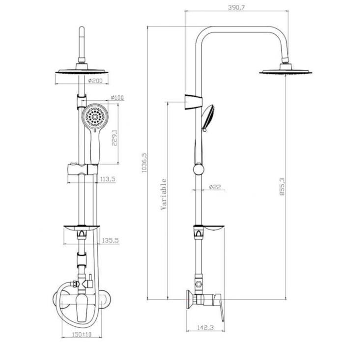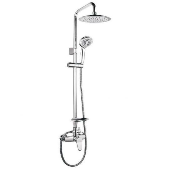 Alfa system natryskowy z deszczownicą i baterią mechaniczną. Powierzchnia chromowana, wykonana z tworzywa sztucznego, stalii gumy. Kolumna posiada rączkę natryskową, z której wydobywać się może 5 rodzajów strumieni. Kolumnę należy zamontować naściennie.