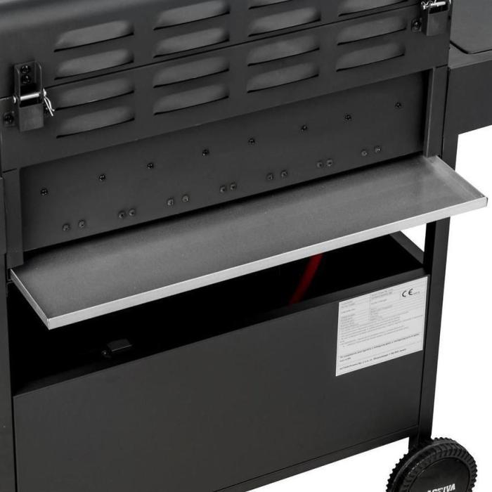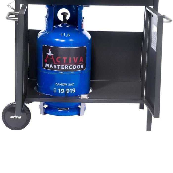 Dwie powierzchnie robocze idealnie sprawdzą się do przygotowania potraw, bądź do odłożenia już gotowych. Palnik boczny, który posiada klapkę, zwiększa dodatkowo miejsce. Kolejny atut to dolna szafka i haczyki na akcesoria. Szafka pomieści 11kg butlę. W pokrętle umieszczono piezo zapalacz, który szybko rozpali grilla. Grill został wyposażony w kółka, co znacznie ułatwie przenoszenie go w inne miejsce. W zestawie znajduje się reduktor i wąż gazowy.
