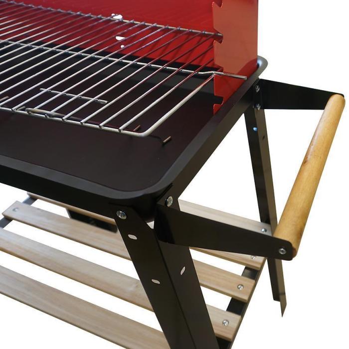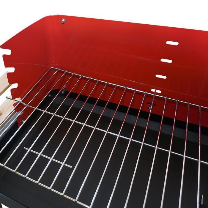Grill posiada emaliowany wiatrochron, który będzie chronił przed wiatrem i niespodziewanymi podmuchami. Dodatkowo posiada ruszt główny oraz ruszt do pośredniego grillowania lub podgrzewania posiłków. Zostały wykonane ze stali chromowanej. Oprócz tego grill został wyposażony w rożen, jedną boczną drewnianą półkę oraz jedną dolną drewnianą półkę. Półki idealnie sprawdzą się do przygotowania potraw, bądź do odłożenia już gotowych oraz do przechowywania akcesoriów grillowych.