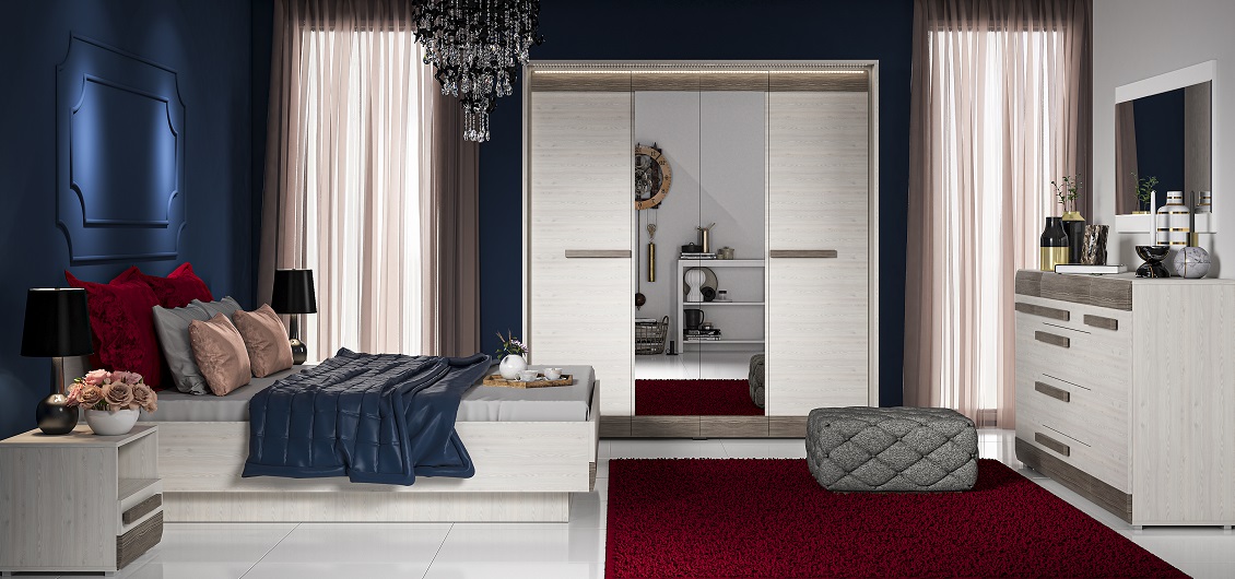 - Komoda dwudrzwiowa z czterema szufladami: To większa wersja komody oferuje jeszcze więcej miejsca na przechowywanie. Dwa drzwi i cztery szuflady pomogą utrzymać porządek w Twojej sypialni.