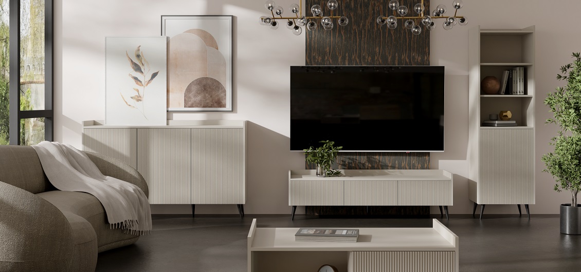Kolekcja mebli do salonu ADEMO to połączenie elegancji i nowoczesnego designu, które wprowadza do wnętrza ciepło i styl. Charakteryzuje się ryflowanymi frontami w kolorze kaszmir, co nadaje meblom unikalny i przytulny wygląd.
