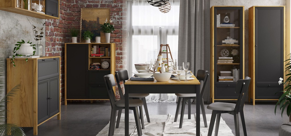 Kolekcja Brent to połączenie nowoczesnego designu z funkcjonalnością, które doskonale wpisuje się w aktualne trendy wnętrzarskie. Charakterystyczne dla tej serii jest zestawienie ciepłego dekoru dąb craft złoty z eleganckimi, czarnymi frontami, co nadaje meblom wyjątkowy i wyrazisty wygląd. Dzięki temu kolekcja świetnie komponuje się zarówno z industrialnymi, loftowymi aranżacjami, jak i klasycznymi wnętrzami.