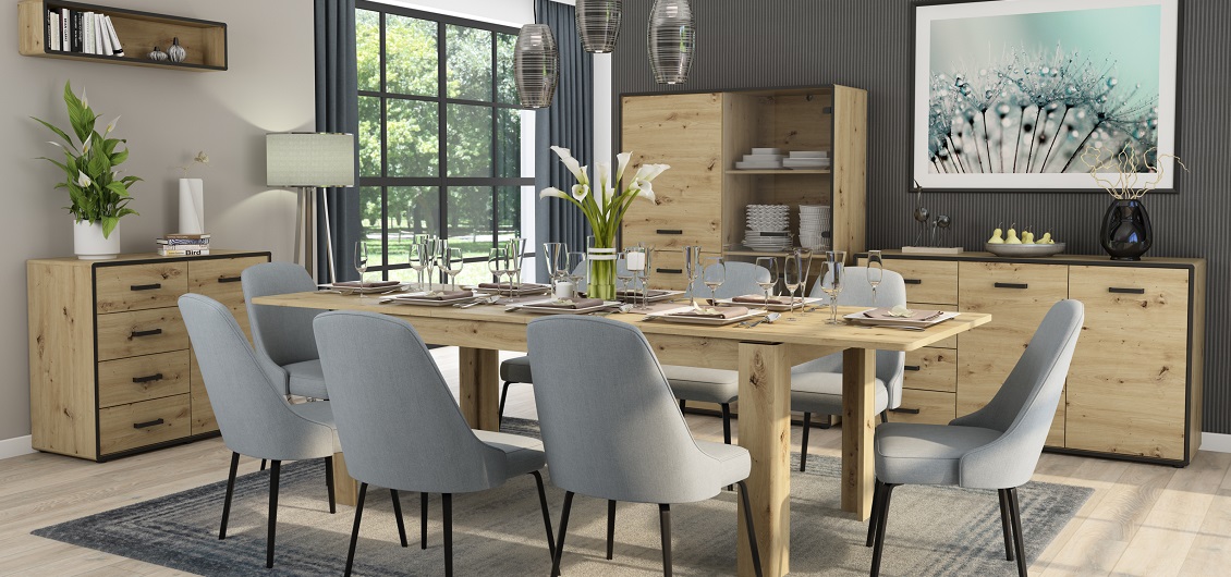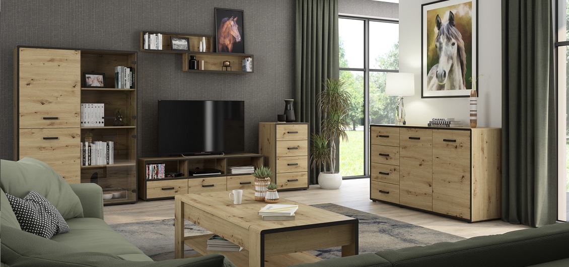 Kolekcja mebli do pokoju dziennego Capannoli to ukłon w stronę nowoczesności, funkcjonalności i estetyki, zapewniający wnętrzu niezwykłe walory wizualne oraz praktyczne zastosowanie. Wykonane z trwałej płyty wiórowej laminowanej, meble z tej kolekcji reprezentują doskonałą jakość i trwałość, gwarantując długotrwałą satysfakcję użytkowania. Charakterystycznym elementem kolekcji Capannoli jest połączenie dekoru dąb artisan z akcentami w kolorze czarnym, które nadają wnętrzu cgarakteru. Matowe wykończenie frontów i korpusów mebli podkreśla nowoczesny styl oraz pozwala na stworzenie spokojnej, harmonijnej atmosfery w pomieszczeniu.
