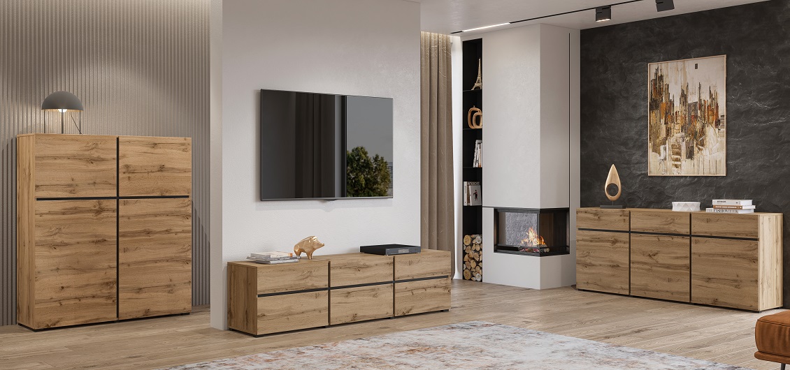 Kolekcja Cross Wotan/Czarny to nowoczesne meble do salonu, które łączą elegancję naturalnego drewna z wyrazistymi, industrialnymi akcentami. Kontrastowe połączenie ciepłego dekoru Dąb Wotan z głęboką czernią tworzy stylowy i przytulny efekt, doskonale wpisując się w nowoczesne oraz loftowe aranżacje wnętrz.