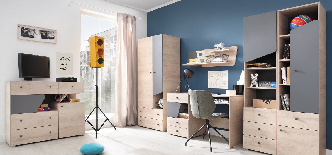 Półki ścienne wiszące to nie tylko praktyczne miejsce na ekspozycję ulubionych dekoracji, ale także element wzmacniający charakter pokoju młodzieżowego. Biurko z szufladami i półką pod klawiaturę to ergonomiczne miejsce do nauki i pracy, doskonale wpisujące się w estetykę kolekcji.