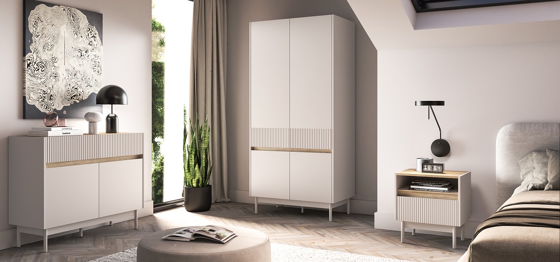 Kolekcja Dunea doskonale wpisuje się w nowoczesny styl aranżacji, ale jej subtelna kolorystyka sprawia, że równie dobrze komponuje się ze skandynawskimi czy minimalistycznymi wnętrzami. Jasne, beżowe wybarwienie w duecie z ciepłym odcieniem dębu cremona dodaje przestrzeni lekkości i naturalnego charakteru. Dzięki temu meble Dunea świetnie prezentują się zarówno w dużych, przestronnych salonach, jak i w mniejszych sypialniach, gdzie istotna jest wizualna harmonia i funkcjonalność.