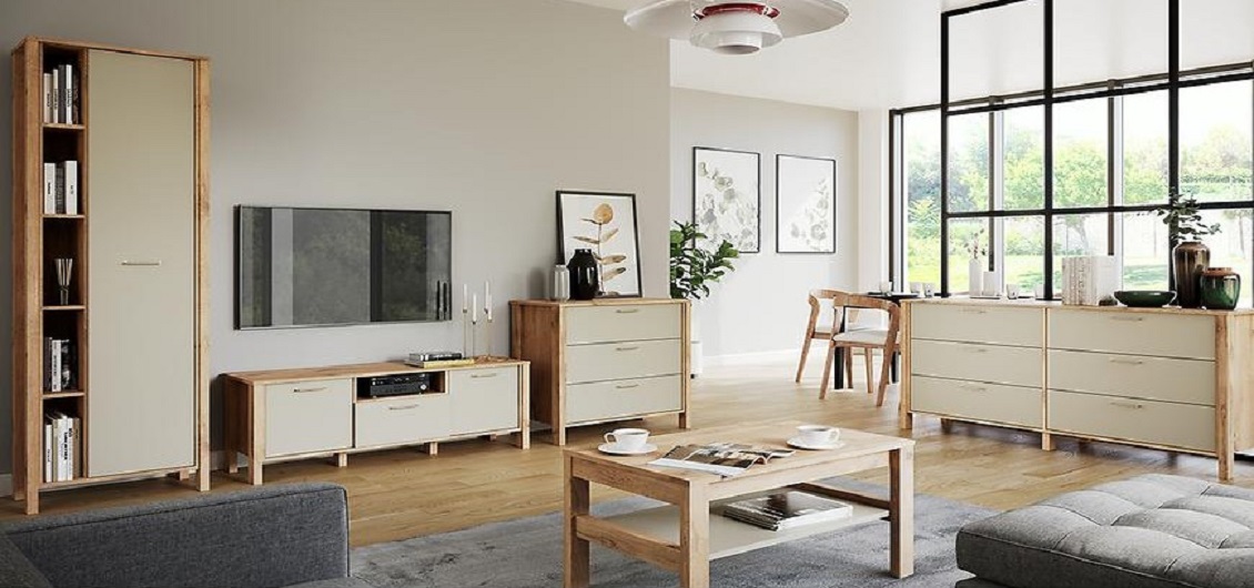 Kolekcja mebli Indygo łączy funkcjonalność z nowoczesnym stylem, idealna do pokoju dziennego i sypialni. Wykonane z wysokiej jakości płyty wiórowej laminowanej w dekorze dąb wotan z elementami w beżowym matowym wykończeniu, meble te zachwycają zarówno estetyką, jak i praktycznością.