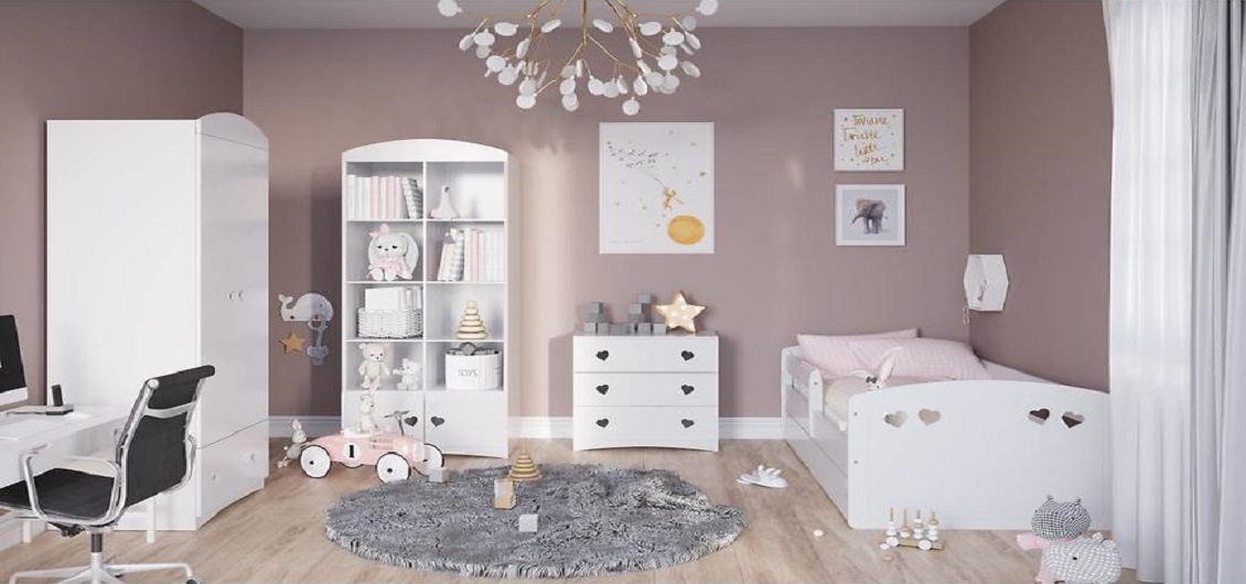 Meble tej kolekcji wykonane są z trwałej płyty wiórowej, co gwarantuje nie tylko solidność, ale również długotrwałą jakość użytkowania. Dostępność w kolorze bieli pozwala na stworzenie neutralnej i jasnej atmosfery w pokoju, jednocześnie umożliwiając harmonijne łączenie z różnymi stylami aranżacyjnymi. Opcje połączenia bieli z pudrowym różem lub szarym dodają subtelności i delikatności, tworząc przyjemną atmosferę.