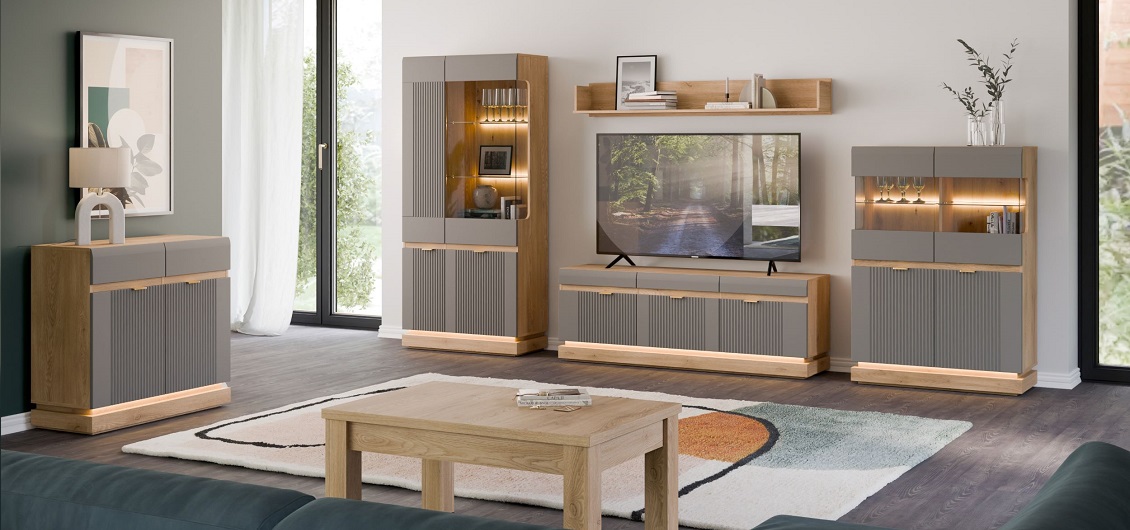 Dodatkowym atutem jest możliwość zamontowania oświetlenia LED – zarówno w witrynach, jak i wybranych segmentach mebli. Subtelne światło nie tylko uwydatnia piękno formy, ale również tworzy przyjemny, relaksujący klimat we wnętrzu – idealny do wieczornego wypoczynku czy rodzinnych spotkań.