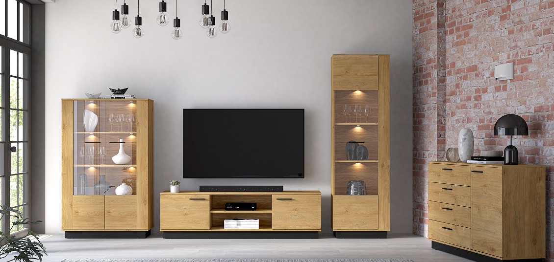 Kolekcja mebli do pokoju dziennego Modesto to harmonijne połączenie stylu i funkcjonalności, które idealnie wpisuje się w nowoczesne wnętrza. Wykonana z wysokiej jakości płyty wiórowej laminowanej, cechuje się trwałością i odpornością na codzienne użytkowanie. Wyjątkowy dekor dąb stylowy w zestawieniu z elegancką czernią nadaje meblom ponadczasowy charakter i subtelną elegancję. Matowe wykończenie frontów i korpusów podkreśla nowoczesny design kolekcji, sprawiając, że stanowi ona doskonałe dopełnienie współczesnych aranżacji.