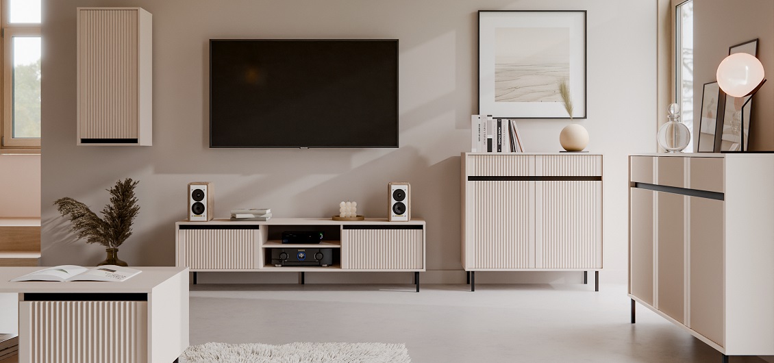 Kolekcja mebli do pokoju dziennego Osaka to doskonały wybór dla miłośników nowoczesnego designu i subtelnej elegancji. Wykonana z wysokiej jakości materiałów – fronty z płyty MDF oraz korpusy z płyty wiórowej laminowanej – zapewnia trwałość i odporność na codzienne użytkowanie. Matowe wykończenie w dekorze beż piaskowy nadaje wnętrzu ciepły i przytulny charakter, jednocześnie wpisując się w aktualne trendy aranżacyjne.