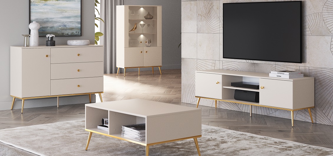 Kolekcja Selgin to meble, które łączą w sobie minimalizm i elegancję. Jasnobeżowe wybarwienie, matowe wykończenie i złote detale sprawiają, że wnętrze staje się stylowe, a zarazem przytulne. To wybór dla osób, które chcą, by ich pokój dzienny prezentował się nowocześnie, a jednocześnie emanował subtelnym luksusem.