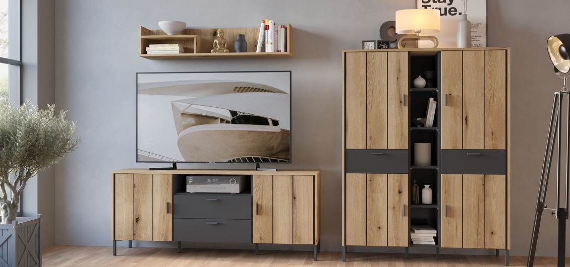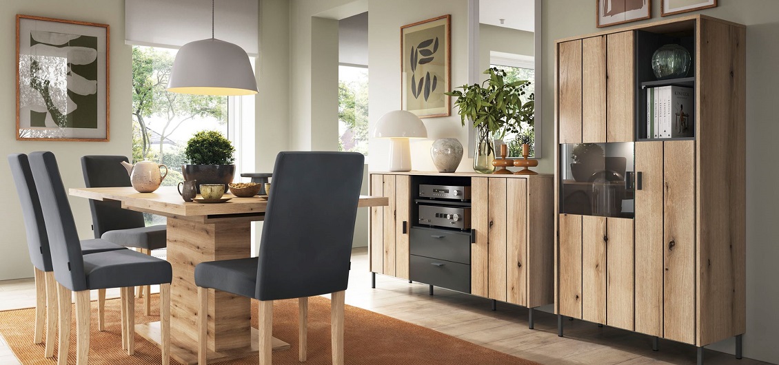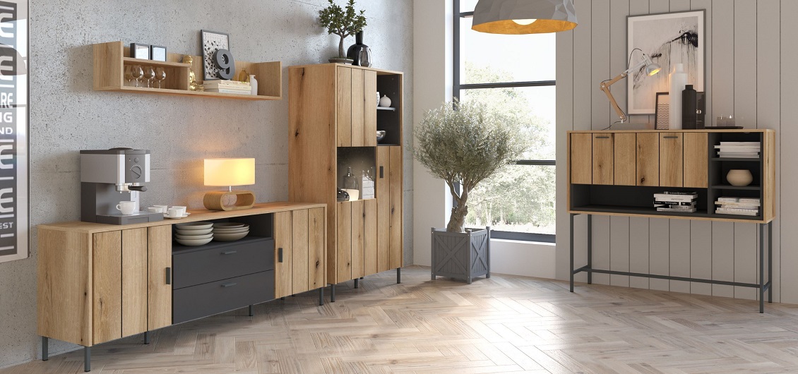 Shirley Dąb to kolekcja, która doskonale wpisuje się w aktualne trendy wnętrzarskie – oferując nowoczesne rozwiązania użytkowe w oprawie inspirowanej naturalnymi materiałami i surowym charakterem loftowych przestrzeni.