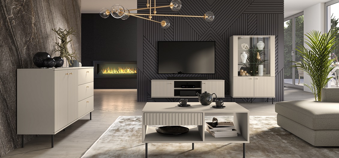 W skład zestawu wchodzą różnorodne komody, elegancka szafka RTV, a także funkcjonalny stolik z dodatkową półką i szufladą. Dopełnieniem salonowej aranżacji jest toaletka z szufladą, a także nowoczesne witryny z półkami, idealne do wyeksponowania dekoracji. Kolekcja oferuje także półkę ścienną oraz lustra, które optycznie powiększą przestrzeń.