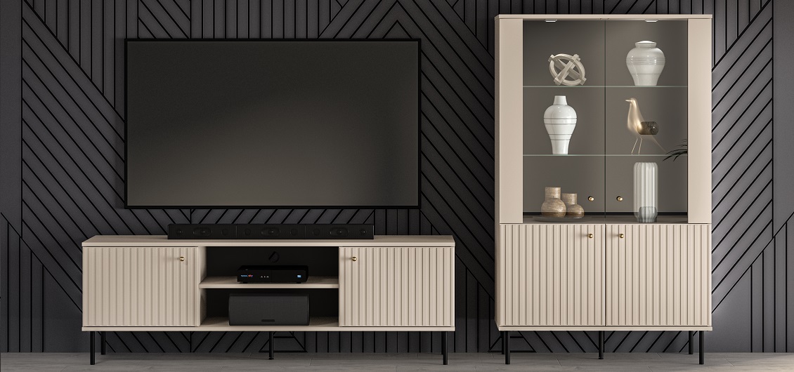 Kolekcja mebli Sophie to doskonałe połączenie funkcjonalności i eleganckiego designu, stworzone z myślą o nowoczesnych wnętrzach. Wykonane z trwałej płyty wiórowej laminowanej i MDF, meble charakteryzują się matowym wykończeniem i modnym dekorem cashmere, który nadaje im subtelny, ponadczasowy charakter. Kolekcja Sophie to kompleksowe rozwiązanie do salonu i przedpokoju, oferujące szeroki wybór elementów do aranżacji przestrzeni.