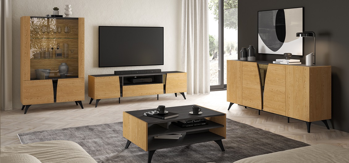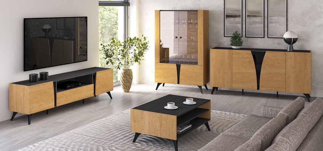 Kolekcja Toscania doskonale wpisuje się w nowoczesny styl wnętrzarski, zachowując jednocześnie ciepły charakter dzięki wybarwieniu inspirowanemu naturalnym drewnem. Jasne fronty w zestawieniu z czarnymi detalami tworzą efektowny kontrast, który dodaje wnętrzu głębi. To meble, które sprawdzą się w nowoczesnych salonach, ale z powodzeniem mogą uzupełnić również aranżacje inspirowane stylem industrialnym czy minimalistycznym.