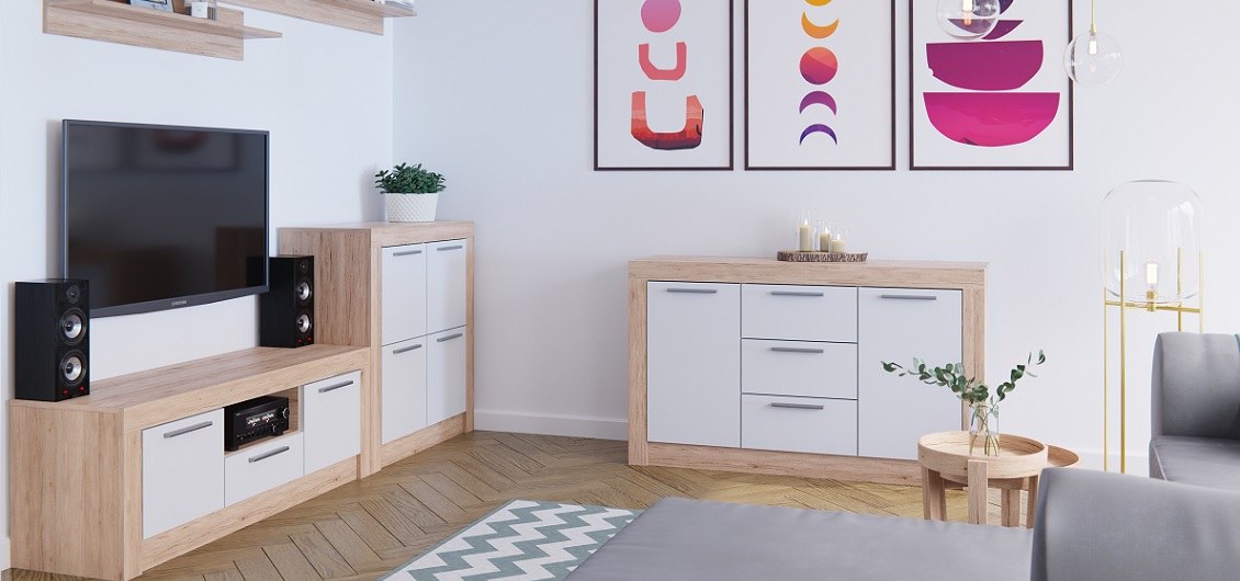 - Szafka RTV z zamykanymi półkami i szufladą to centrum Twojego salonu. Doskonale pomieści sprzęt RTV oraz pozwoli na przechowywanie innych niezbędnych rzeczy. Jej minimalistyczny design doskonale komponuje się z resztą kolekcji.