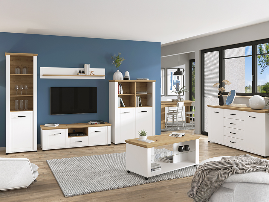 Kolekcja mebli do pokoju dziennego Valencia to idealna propozycja dla miłośników nowoczesnego stylu i funkcjonalnych rozwiązań. Charakteryzuje się eleganckim połączeniem matowego białego z ciepłym, naturalnym dekorem dąb artisan, co nadaje wnętrzu przytulności i współczesnego charakteru. Meble wykonane zostały z trwałej płyty wiórowej laminowanej, co zapewnia odporność na codzienne użytkowanie i łatwość w utrzymaniu czystości.