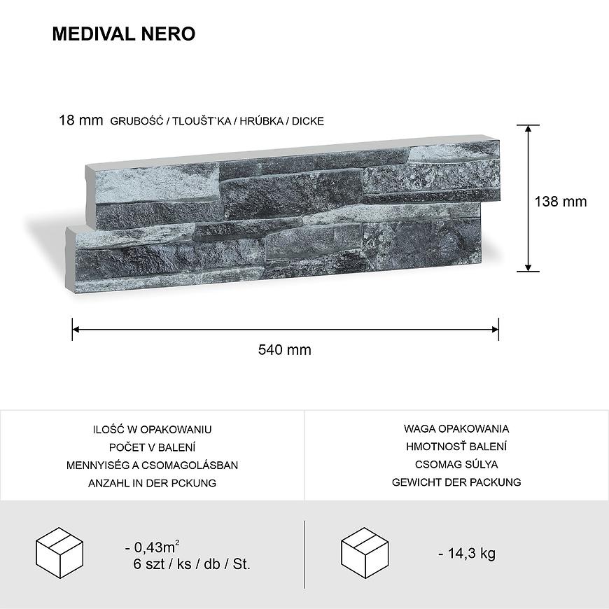 Kamień Betonowy Medival Nero to dekoracyjna płytka betonowa, która doskonale imituje naturalny kamień, nadając wnętrzom i elewacjom elegancki, nowoczesny charakter. Grafitowy kolor sprawia, że produkt harmonijnie komponuje się z różnymi stylami aranżacji.