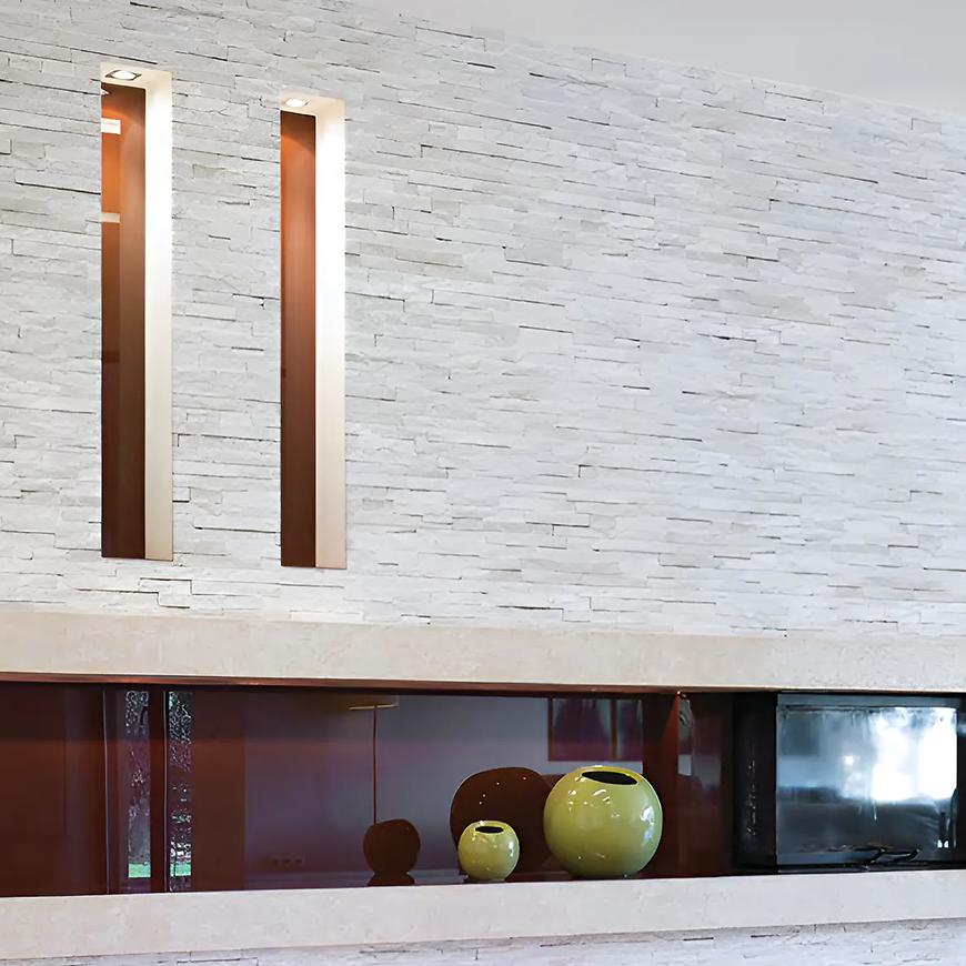 Wykonana z naturalnego kamienia, we wnętrzach doskonale sprawdzi się jako dekoracyjna okładzina ścian w salonie, przedpokoju, łazience czy kuchni, dodając pomieszczeniom nowoczesnego i surowego klimatu.