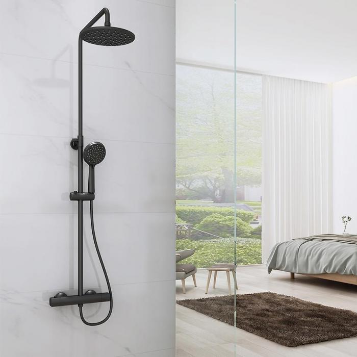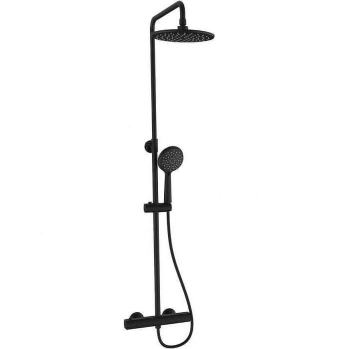 Czarna kolumna natryskowa Vivaldi z termostatem. Powierzchnia chromowana, wykonana z tworzywa sztucznego, metalu i PVC. Kolumna posiada rączkę natryskową, z której wydobywać się mogą 3 rodzaje strumieni. Kolumnę należy zamontować naściennie.