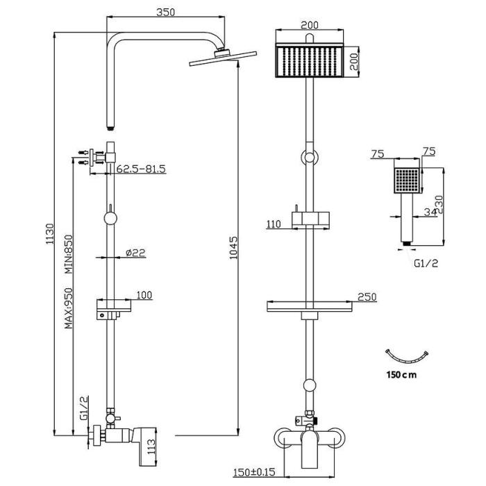 Kolumna natryskowa z baterią mechaniczną o długości 113 cm, wykonana w kolorze chromu z tworzywa sztucznego. Do zestawu dołączony jest wąż natryskowy o długości 150 cm.