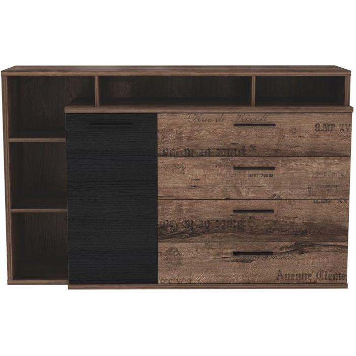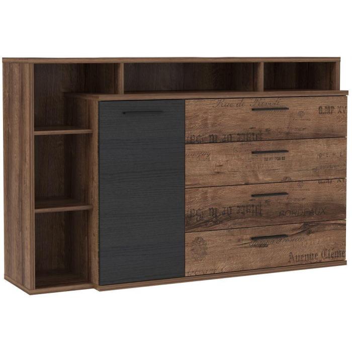 Prezentowana komoda Jacky JCKK351L to jeden z mebli należących do sypialnianej kolekcji Jacky. Model będzie świetnym wyborem zwłaszcza w przypadku eleganckich, stylizowanych na loft mieszkaniach. Ciemne kolory i prosta forma wzbogacona ciekawym ułożeniem półek to cechy, które wspólnie tworzą wyjątkowo designerską propozycję. Jednodrzwiowa komoda Jacky JCKK351L posiada cztery wewnętrzne szuflady oraz wewnętrzne półki, a także uchwyty metalowe w kolorze czarnym. Oprócz tego pojawia się pięć półek umiejscowionych na zewnątrz. Dzięki wszystkim półkom i szufladom z łatwością można przechować wiele rzeczy - ubrań czy dodatków. Mebel zaprojektowano w kolorach dębu szlachetnego, dębu szlachetnego tekstowego oraz ponadczasowej czerni, znajdującej się na uchwytach i drzwiach komody. Komodę zapakowano w trzech paczkach do samodzielnego, niezwykle prostego montażu. Wymiary paczek: 1/3.106,2x44,9x9,6 2/3. 134,7x46,2x8,3 3/3.163,2x36,7x8,3 cm
