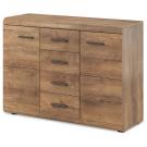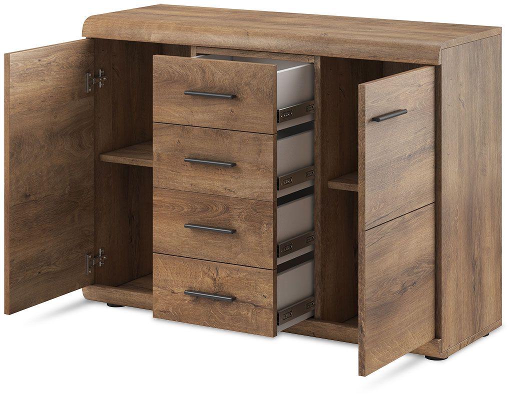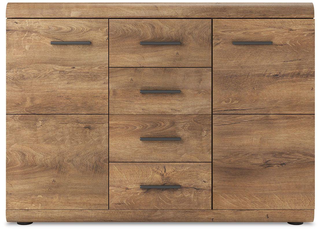 Spójne połączenie tradycji z nowoczesnością może uczynić z mebla istotny element wystroju wnętrza, który dodatkowo odegra w nim niebagatelną rolę. Dwudrzwiowa komoda Lena stanowi nie tylko estetyczne miejsce przechowywania różnorodnych przedmiotów, ale także nadaje wnętrzu charakteru. Cechuje ją duża pojemność, ponieważ znajdują się w niej aż cztery szuflady oraz półki. Uchwyty umożliwiające ich otwarcie są czarne i idealnie korespondują z całą elegancką kompozycją, mimo tego, że stanowią nieco bardziej nowoczesny element. Realistyczne odwzorowanie usłojenia drewna w kolorze ciemnego dębu Lefkas nadaje komodzie Lena naturalności. Jej interesująca bryła i estetyczne wzornictwo sprawiają, że doskonale uzupełni aranżację stylowego biura lub gabinetu. Mebel do samodzielnego montażu.