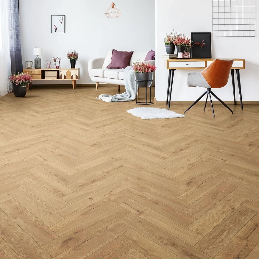 Dekor w postaci dębu nadaje pomieszczeniu naturalny i ciepły charakter, jednocześnie dodając mu elegancji i prestiżu. Wzór paneli w formie jodełki oraz struktura drewna nadają im autentyczności i oryginalności.