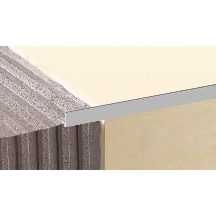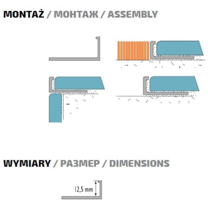 Profil narożny L o długości 250 cm i szerokości 2.4 cm zabezpiecza krawędzie wyłożone płytkami ceramicznymi. Jest tez zakończeniem nawierzchni płytki w przypadku gdy styka się z innym rodzajem nawierzchni np. dywanem, wykładziną.