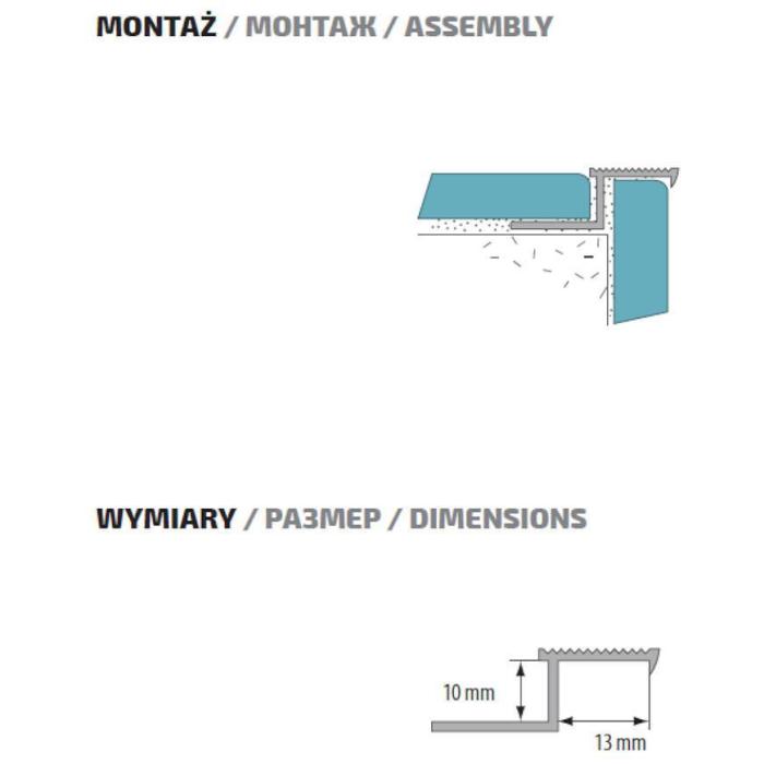 Profil służy do ochrony krawędzi stopni schodowych, wyłożonych płytkami ceramicznymi. Powierzchnia jest ryflowana, co tworzy zabezpieczenie antypoślizgowe.