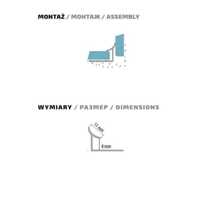 Przy poprawnym ułożeniu płytek profil ten może służyć jako osłona dylatacji. Zabezpiecza i maskuje wewnętrzne kąty połączeń płytek ceramicznych.