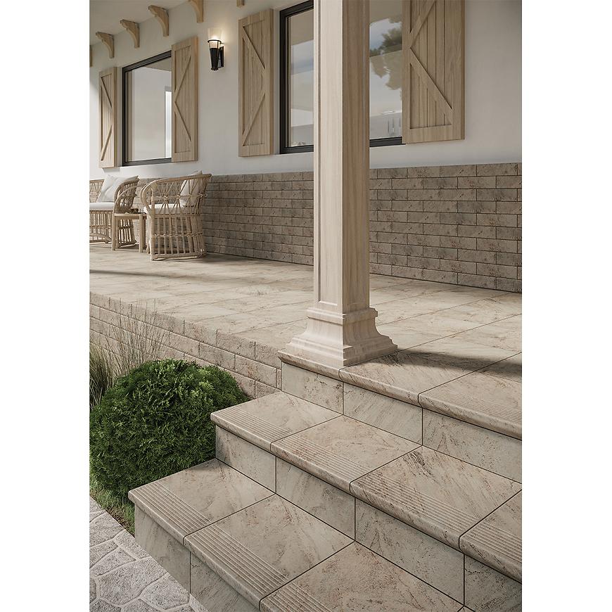 Stopnica Prosta Kapimos Mattone Pietra Beige 30/33 to trwała stopnica klinkierowa o wymiarach 33 × 30 cm i grubości 1,1 cm. Matowa powierzchnia w odcieniu beżowym imituje naturalny kamień, nadając elegancki wygląd. Produkt jest mrozoodporny, o wysokiej klasie ścieralności 4 i antypoślizgowości R10, gwarantując bezpieczeństwo i długotrwałą funkcjonalność. Sprzedawana w opakowaniach, solidna konstrukcja zapewnia trwałość na lata.