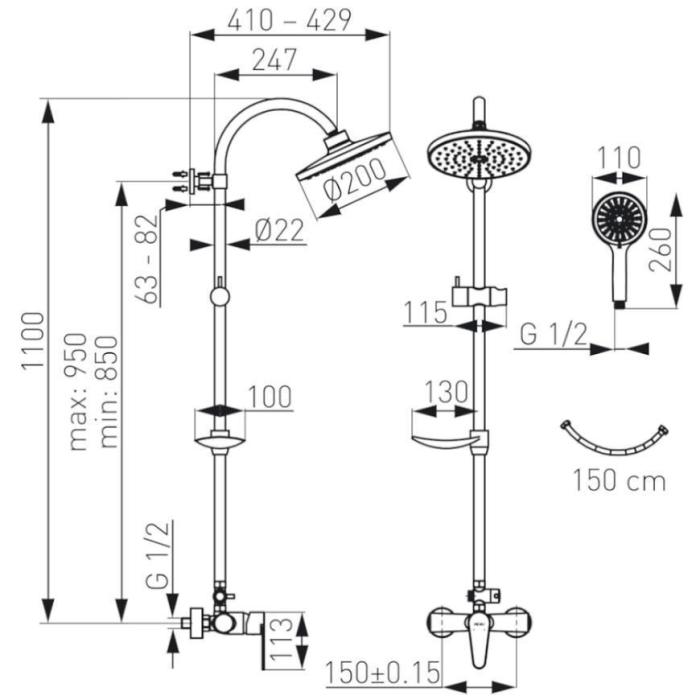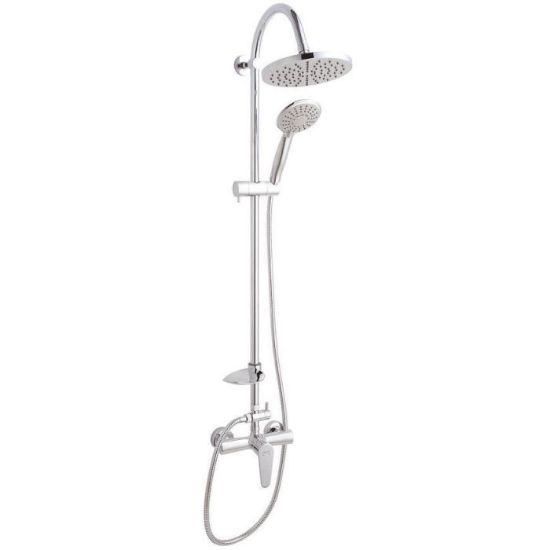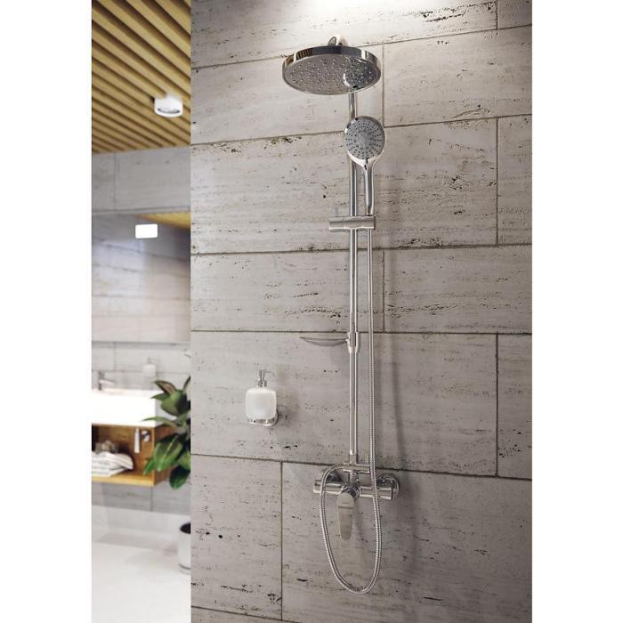 Zestaw natryskowy z baterią mechaniczną, wykonany z metalu w kolorze chromu. Rączka natryskowa wykonana z tworzywa sztucznego posiada 3 strumienie.