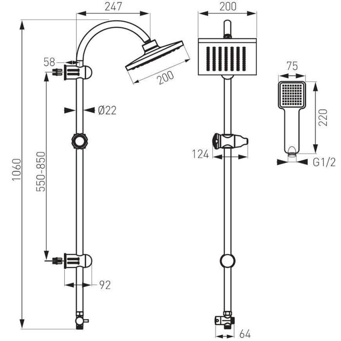 Zestaw prysznicowy o długości od 106 cm, wykonany z metalu w kolorze czarnym. Do zestawu dołączony jest wąż natryskowy o długości 150 cm.