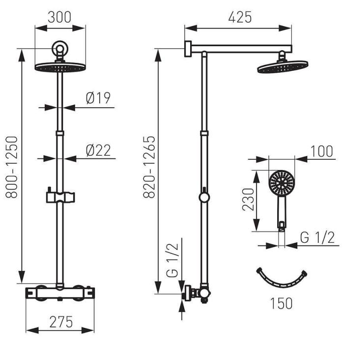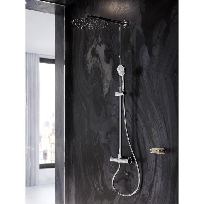 Zestaw prysznicowy z baterią termostatyczną, wykonany z metalu w kolorze chromu. Rączka natryskowa wykonana z tworzywa sztucznego posiada 3 strumienie.